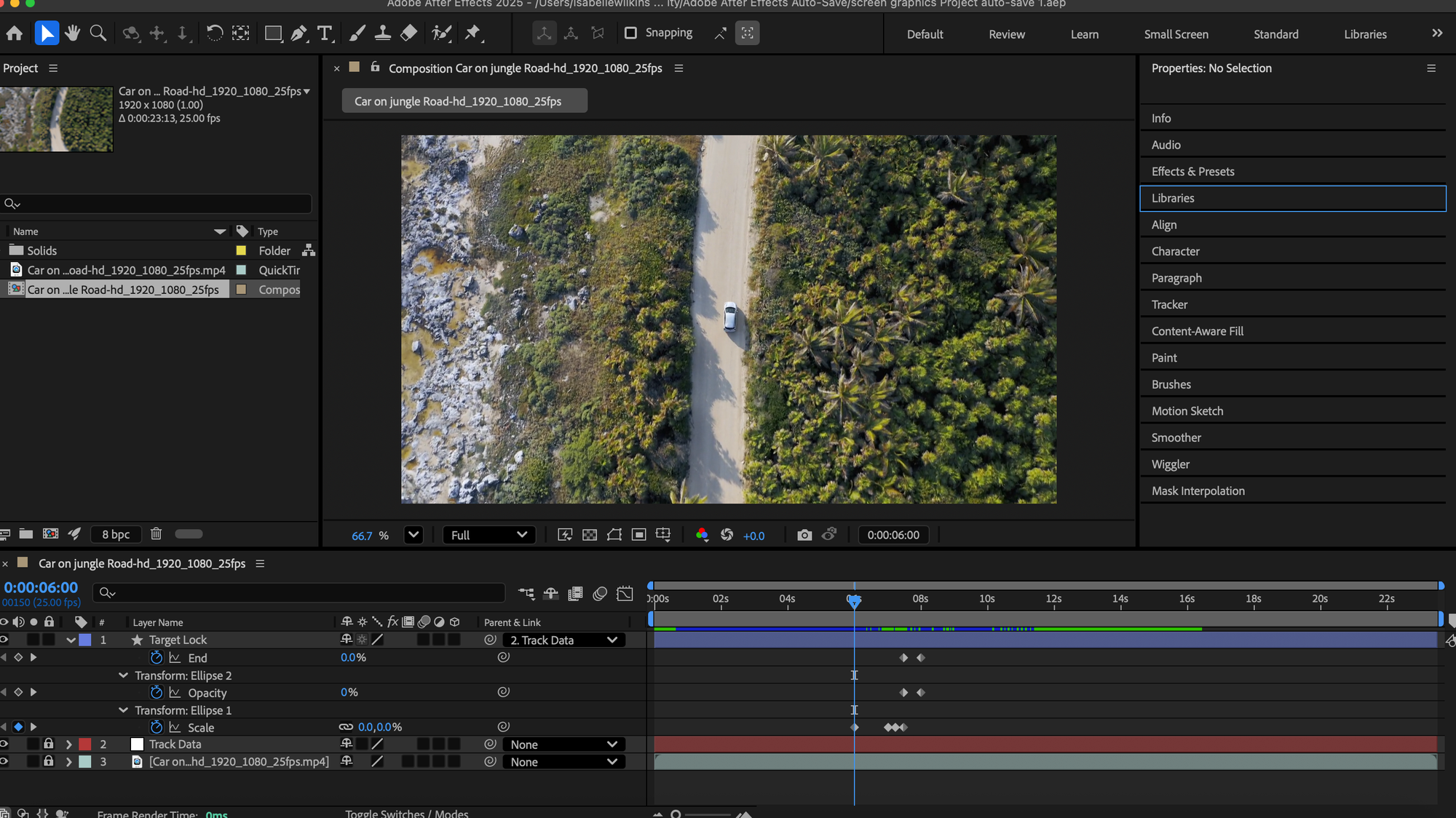 We began working on after effects with the video of the car on the jungle road, working out how to track the car.