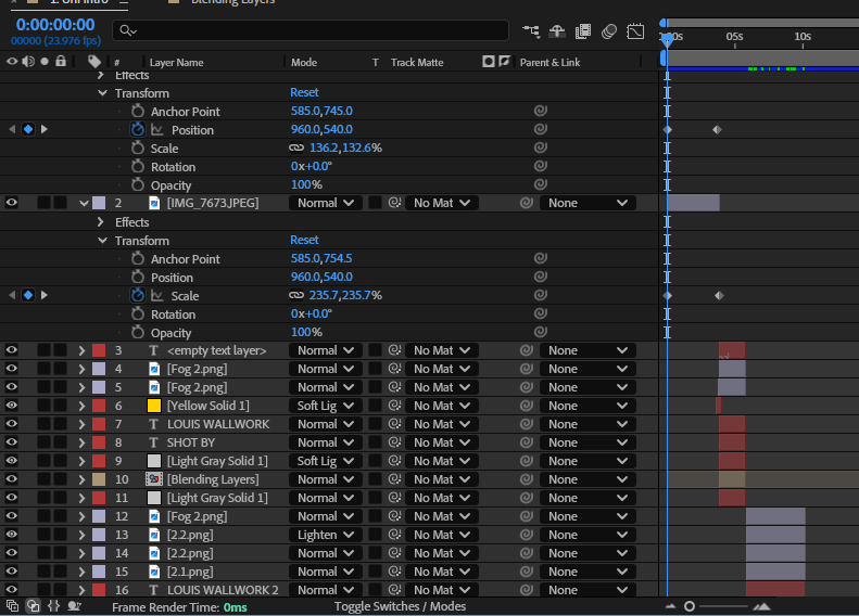 Adding keyframes was essential to the intro as it felt flat without. I used a mix of rotate position and scale to give the effect the images were actually videos. I also added a fog effect to create more depth within the image. In all of the shots it slowly scales across.
