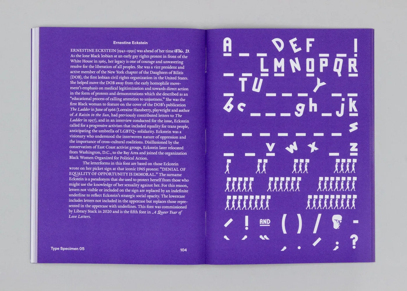 A Queer Year of Love Letters is a collection of fonts, love letters, and stories to remember both queer and trans histories. The fonts are inspired by notable queer individuals and their stories from the past several decades. [4] Pyper uses biographies, unseen archival materials and the fonts as a sort of a time machine to bring awareness to queer history. The book serves as an archive, allowing readers to easily connect with the history through Pypers’ fonts and learn about both the artists and their contributions to the queer and trans communities.
