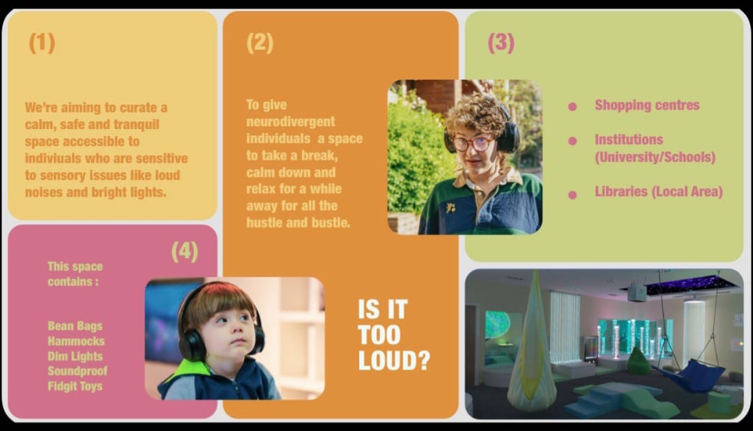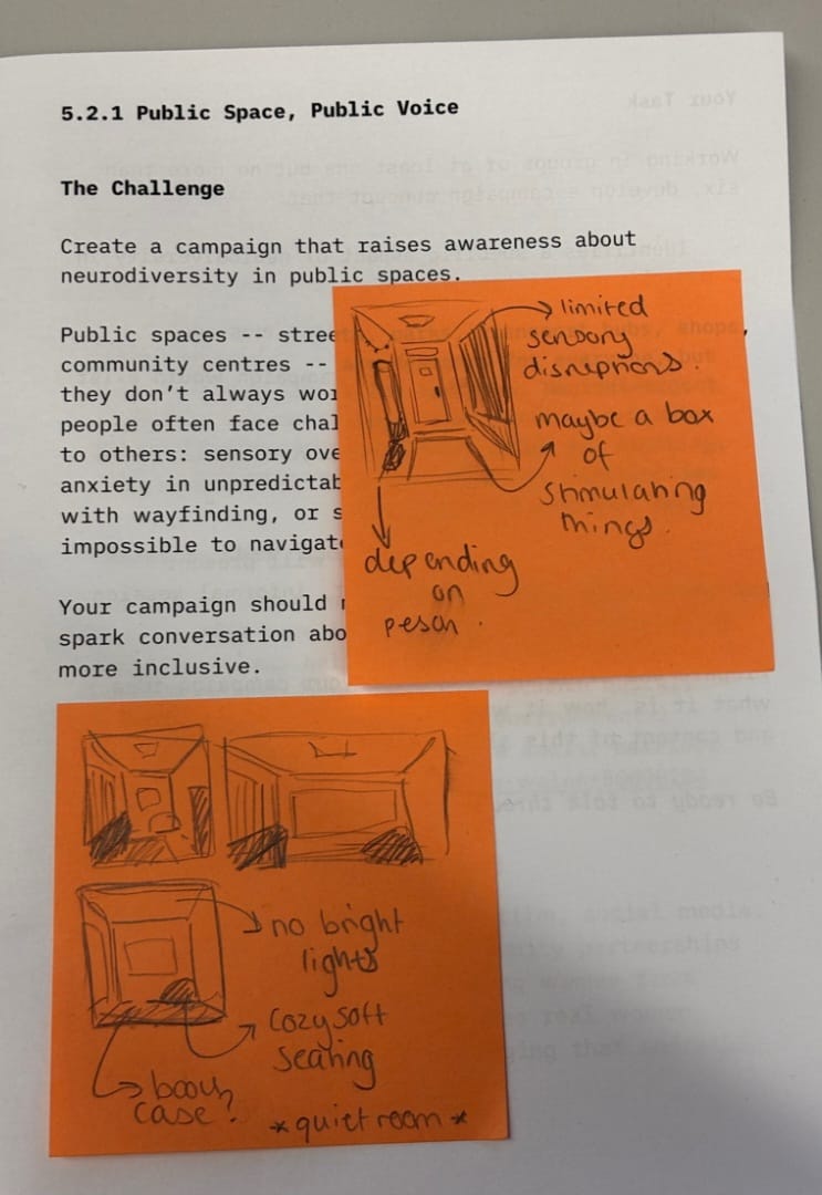 This is the work that my group and I came up with during the brief. The concept is a quiet room designed for neurodivergent people, found in shopping centres and other crowded spaces, since being in crammed and loud places can be quite overstimulating and exhausting when you have to get your necessities. Our idea mostly caters to younger people since it's based on quite rooms found in schools.