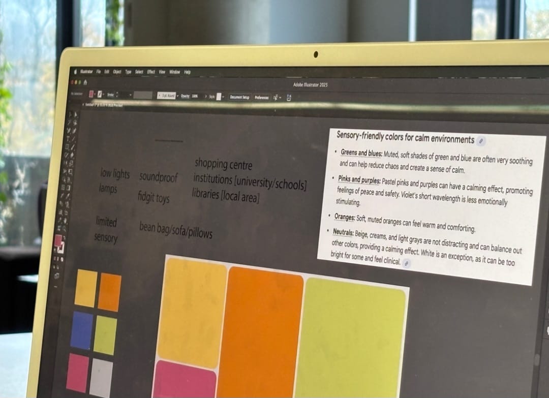 Here are some of our Ideas and sketches, picked out a colour scheme and aesthetic (sensory-friendly colours) suitable for what we picked.