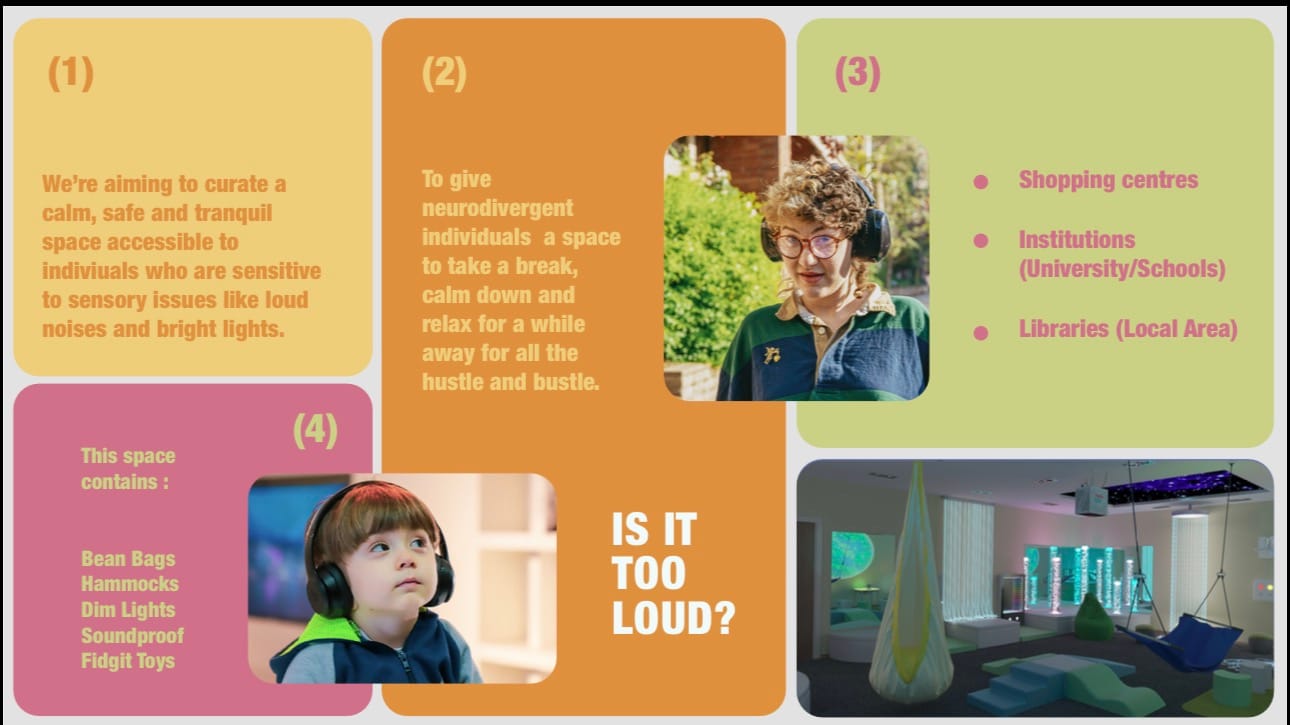 These were Katie's initial ideas, and this is what helped us build our idea and start to brainstorm different ideas that would best fit the demographic. We believed that for our specific campaign, our demographic would be a younger age group, and we would use that to inspire our idea of a quiet room/sensory room. As this brief was not a 'real' brief, we were told that we would have 'unlimited funds' to be able to broaden our ideas and have no limits. When talking about our ideas, we thought about things like the location of where a sensory room could be, and we came up with things like universities, shopping centres and libraries. This is because these are very public areas that also could become very crowded or overwhelming for some people. As we continued to look into this idea, we started to think about the types of things that would be included inside one of these rooms, and we came up with things like fidget toys, dim lighting, beanbags, as well as possible soundproofing on/in the walls or doors that would prevent loud noises that could affect someone.