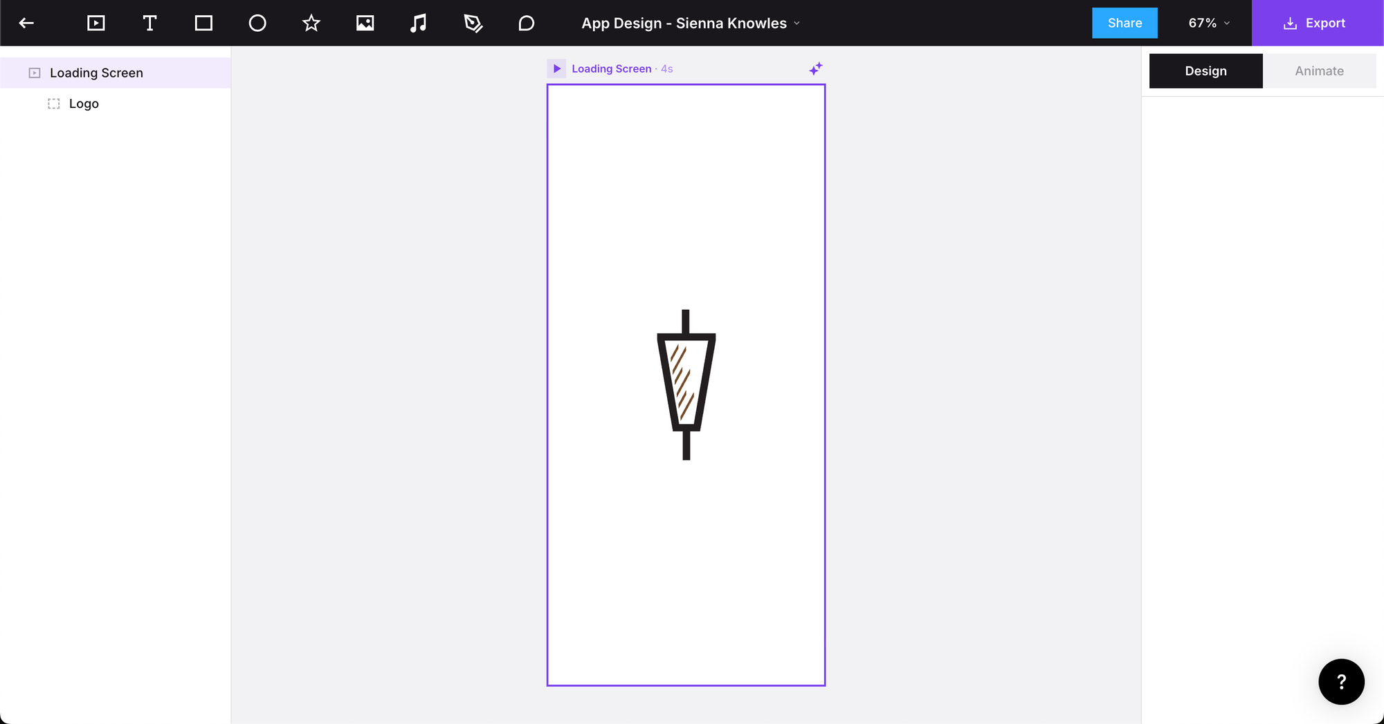 To make this proposal into a product, I'd have to revisit the workspace where I had my 4.4 UX project and open up my app design prototype file. From here, using the skills and knowledge I learned in the Jitter solar systems animation workshop, I know that I can select one page of the workspace and open it with the Jitter plugin from the bottom dock. This brings my design to a new page within the Jitter extension where I can add animations to already existing images on my page.