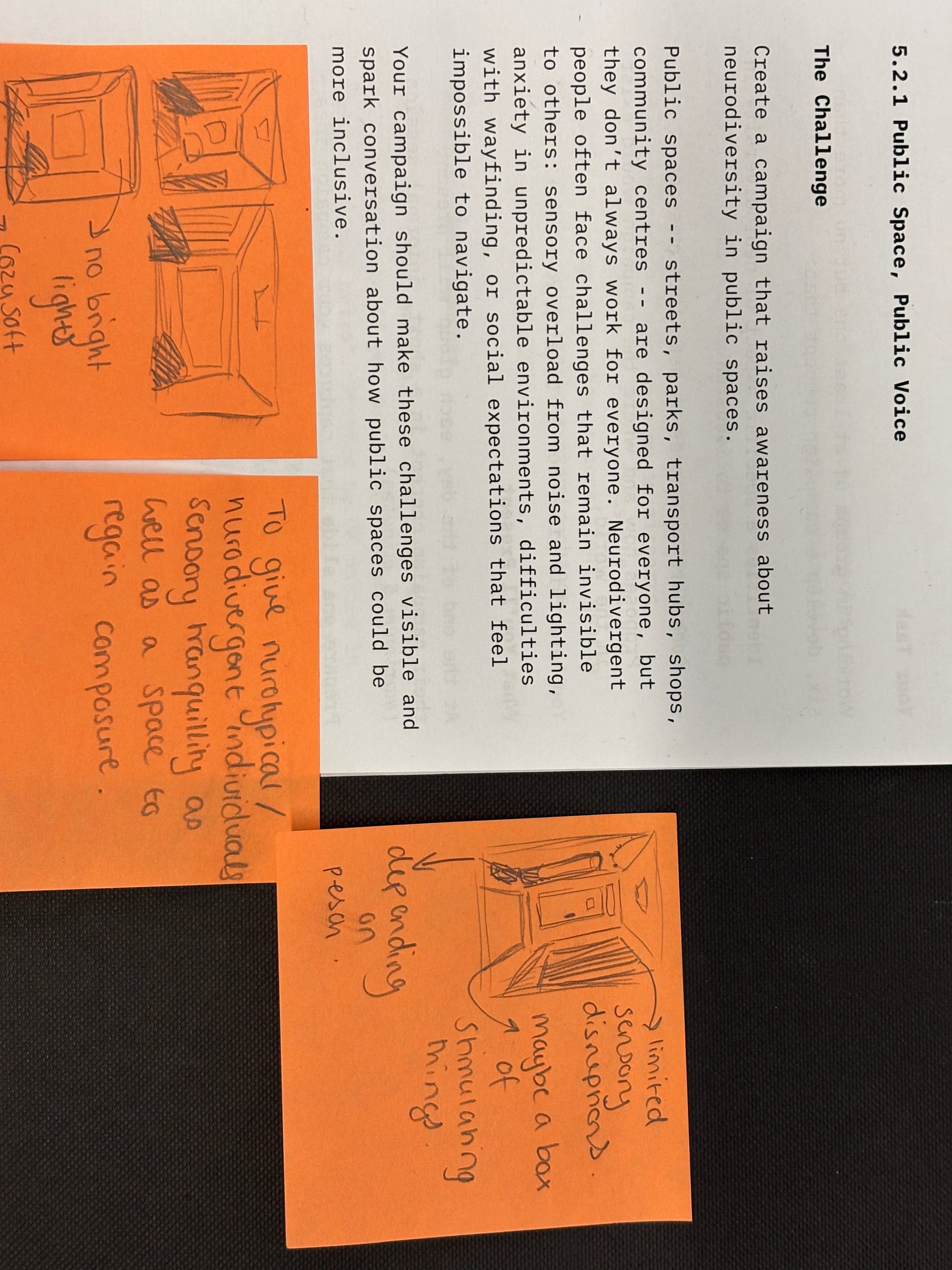 To begin our module on technologies we were given a mini brief to create a campaign that raises awareness about neurodiversity in public spaces. We had to find a way to see how public spaces could be more inclusive and/ or safe.