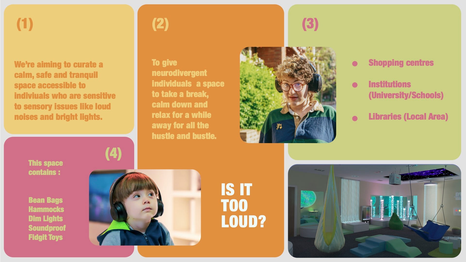 For my initial ideas I initially thought of a quiet room/ safe space for those who need it in a public area. Our group stuck to a younger age demographic as it seemed that the already idea of quiet rooms/ sensory rooms were severally lacking most likely due to funding. This was only a 'fake' brief and we had 'unlimited funds' in this instance so we didn't have to consider that. We considered things like locations that we could have these sensory rooms in like Shopping centres, Institutions (University/Schools) and Libraries in local areas. We also looked into what we could include in these spaces like bean bags, hammocks, dim lights, soundproofing in the walls and doors as well as fidget toys.