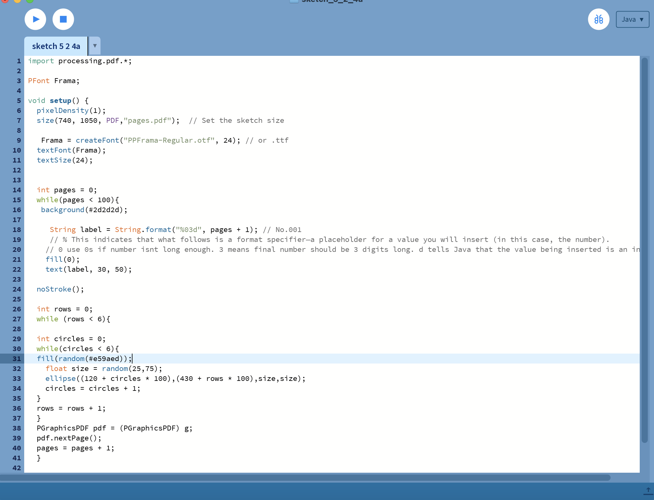 I enjoyed this session much more than I thought I would, even though I didn't really understand any of the code. When I got home I played around with it adding more onto the basics. I tried to research on the processing website what code I needed however I couldn't get it to work so I ended up asking chatGPT to help. I still learnt a lot from doing this and I think I could make some really interesting artwork with it in the future. I think I enjoyed the problem solving element to this even though I couldn't get it to work on my own in the end.