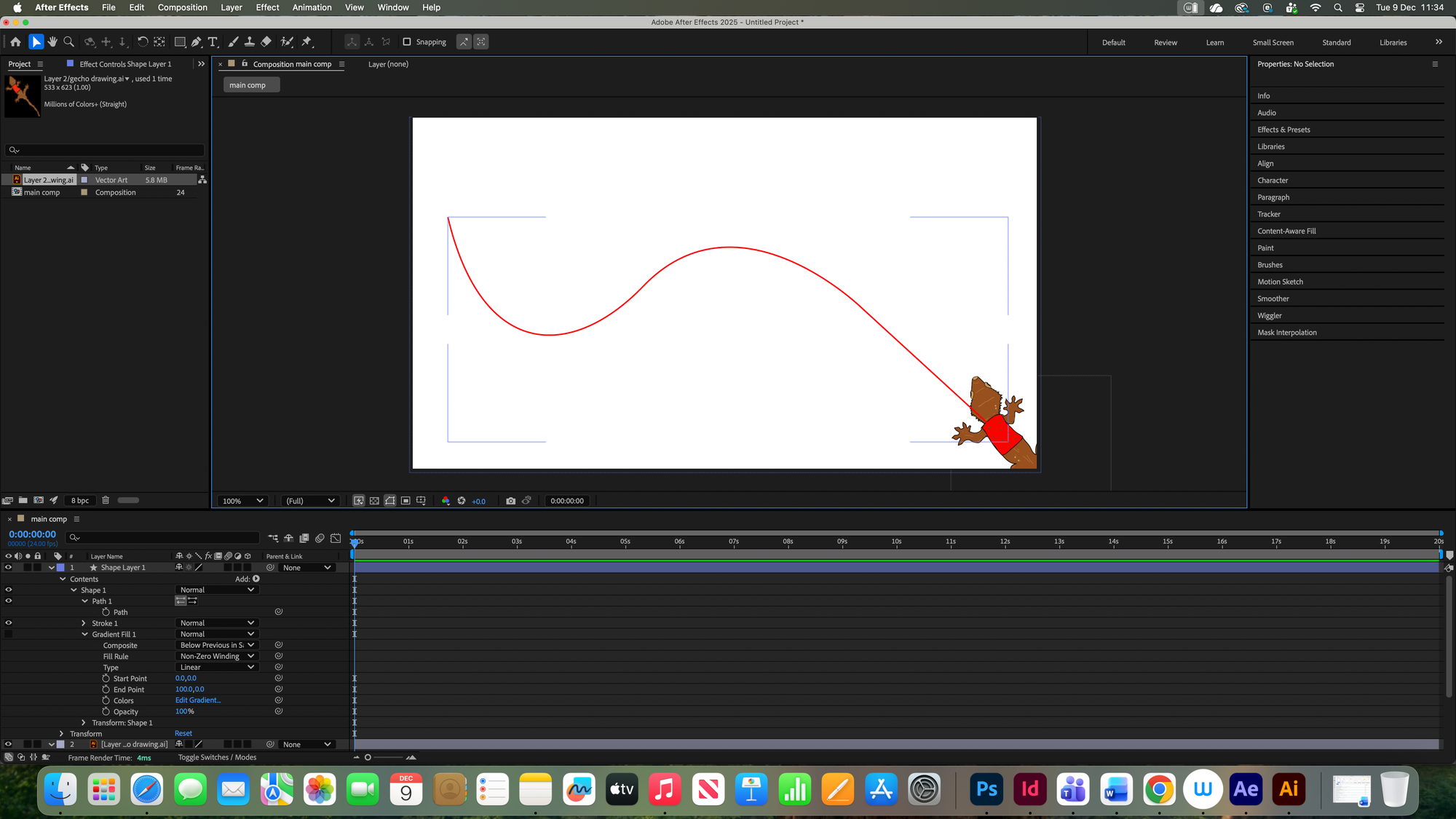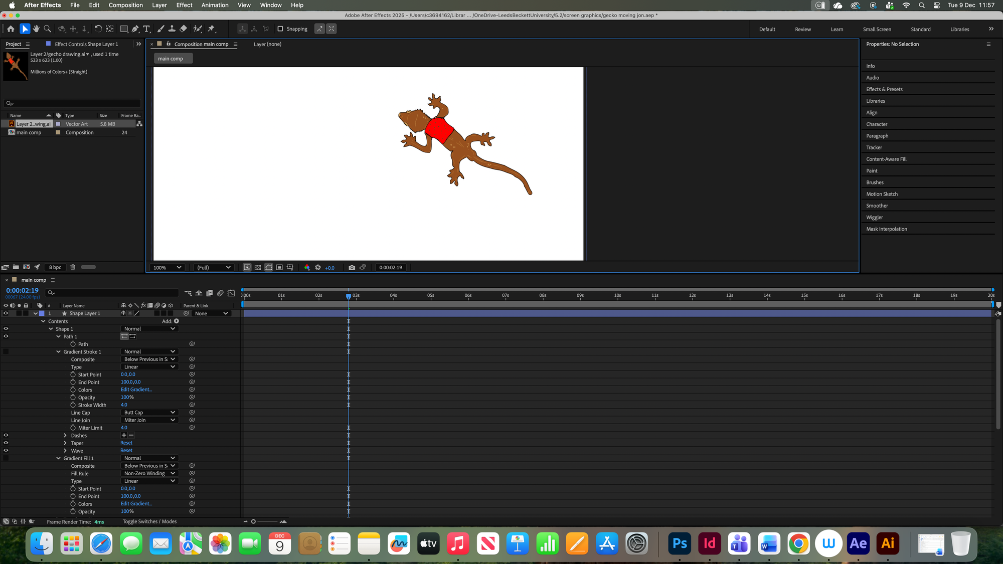 We then transferred this over to AfterEffects so we could animate it so it looks like it was walking. Given the time we had, I couldn't finish it fully walking along the path I made. However, I got the idea of it and understand how to achieve it. It wasn't as complex as I thought and was really funny to start seeing my gecko move. Using the pins let me move the gecko how I wanted and what legs go what direction. I would love to spend more time doing something like this, but it was difficult to get the Wacom tablets when they were available, I would definitely look into buying my own and practicing more with doing animation using it.