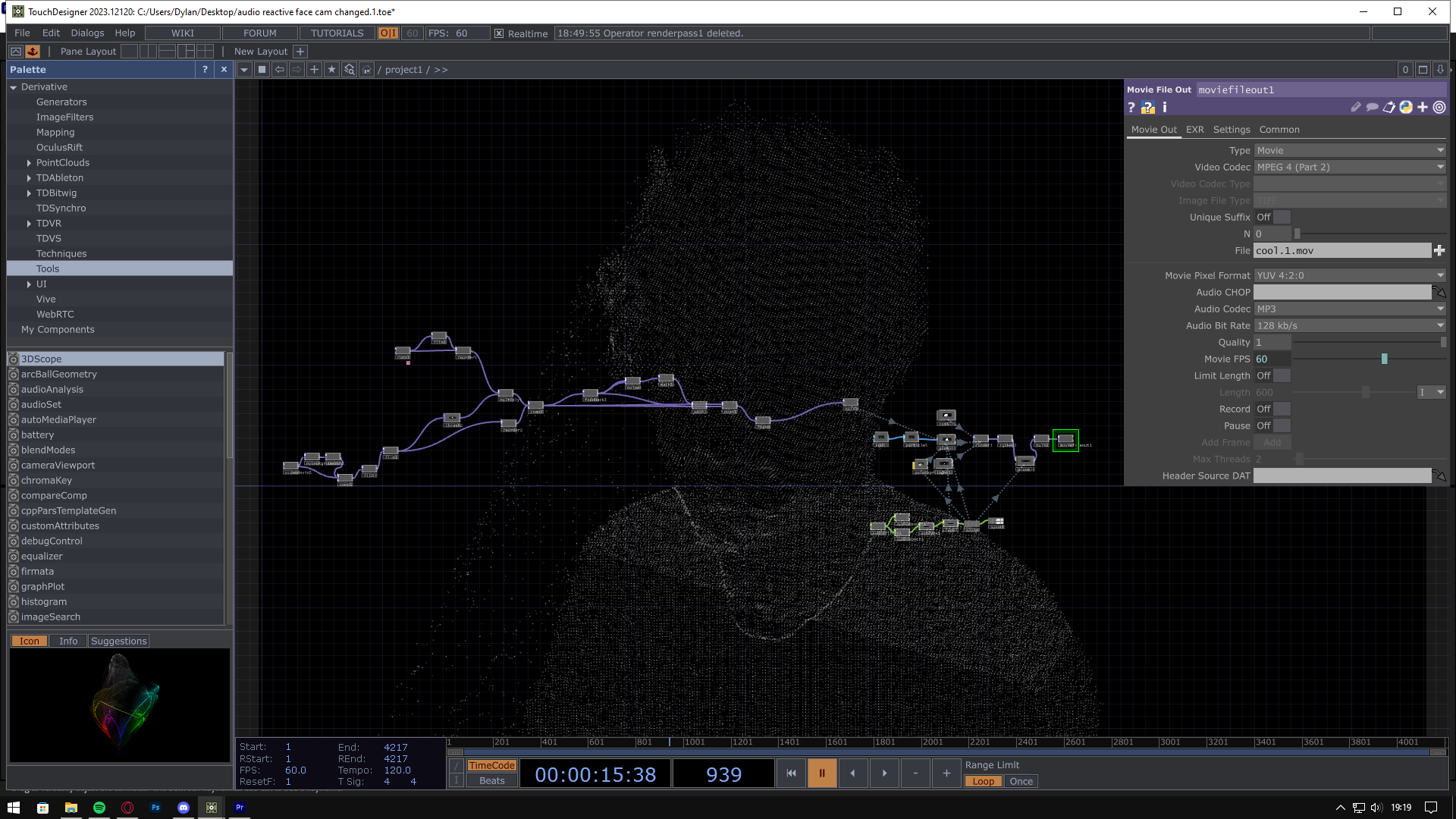 For this experiment I went further into the live visuals using my webcam. creating a point cloud effect with audio reactivity using the chop feature with math, for the effect itself I had converted my webcam feed into rgb values which are converted into 3d using instancing through the colour values which allows for depth when there is no 3d scanning used at all, in the future i could made the 3d effect more substantial using a kinect with an adapter to the computer which would allow for the use of the ir camera for depth.