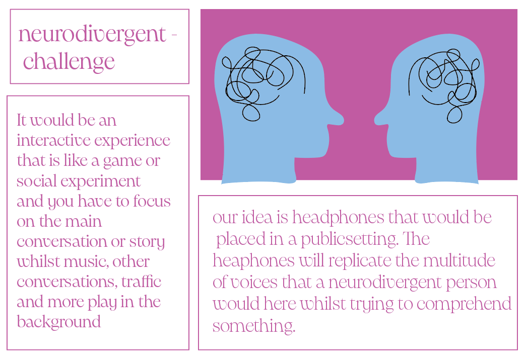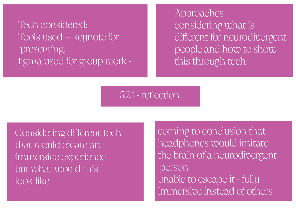 Through the reflection, I tried to explain how we got to our final idea of an immersive experience with headphones; however, I then considered that this idea would perhaps be better off in an exhibition or art gallery that celebrates and explains neurodiversity to neurotypicals and creates a fun and educational environment.
