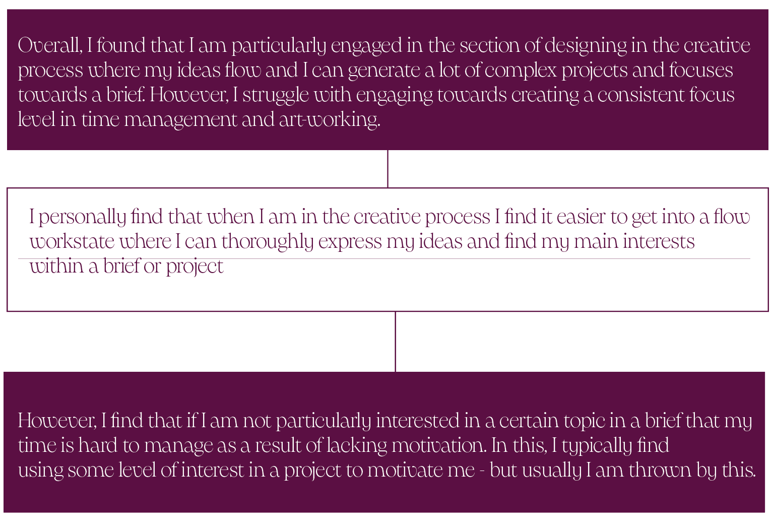 Overall, I found that I am particularly engaged in the section of designing in the creative process where my ideas flow and I can generate a lot of complex projects and focuses towards a brief. However, I struggle with engaging towards creating a consistent focus level in time management and art-working.