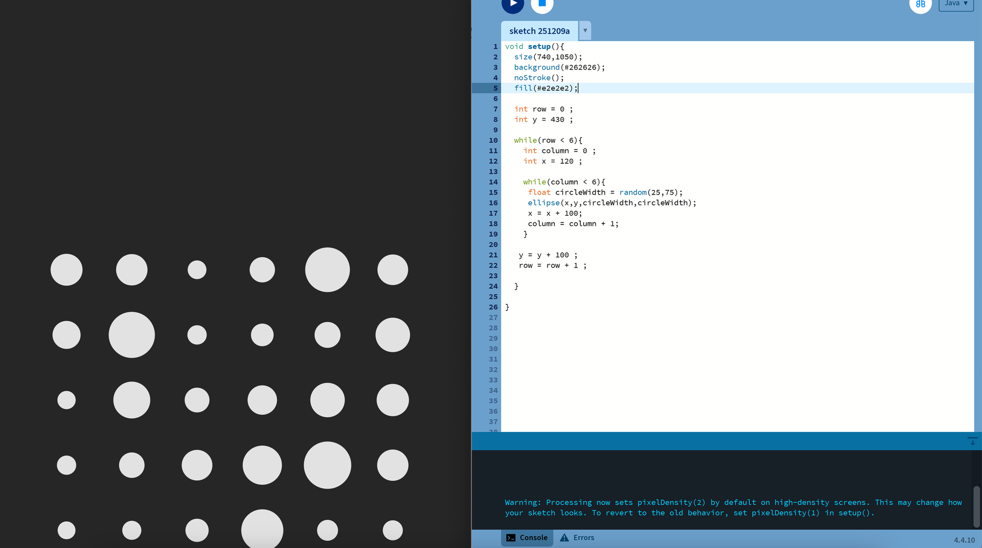 I programmed using sketch to create a 6 by 6 row of randomised dots. I found understanding the lines of code interesting and thought about how this could be used further. However, I did not particularly enjoy the coding as it wasn't my favourite ; however did enjoy learning how to read code.