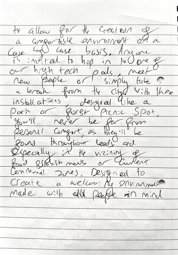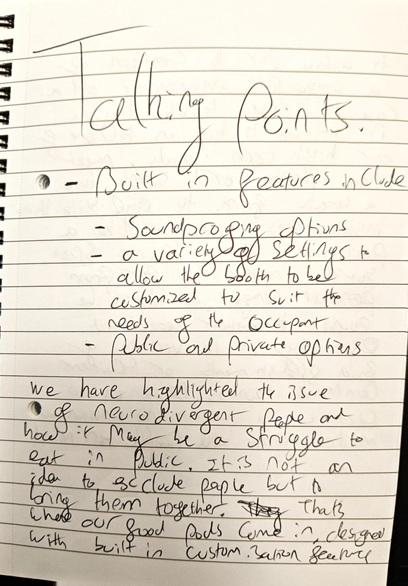 The initial idea was to create an underground train service, which would allow for customizable environments to better suit each persons needs, allowing for headphones to be connected, and the noise to be reduced amongst other features. We moved away from that however, as we all weren't confident in the idea. It was Matthews suggestion to make the idea smaller in scope, localized within or near food establishments within Leeds, such as up in Trinity kitchen.