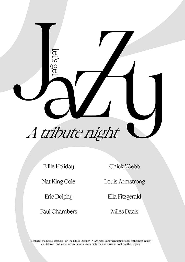 I am proposing to animate certain key aspects of this poster, including the title, in attempts to replicate the movement of jazz music and enable the target market of my poster (Jazz enthusiasts and Speakeasy goers) to take interest as well as visualize the 'concert' that is being marketed.