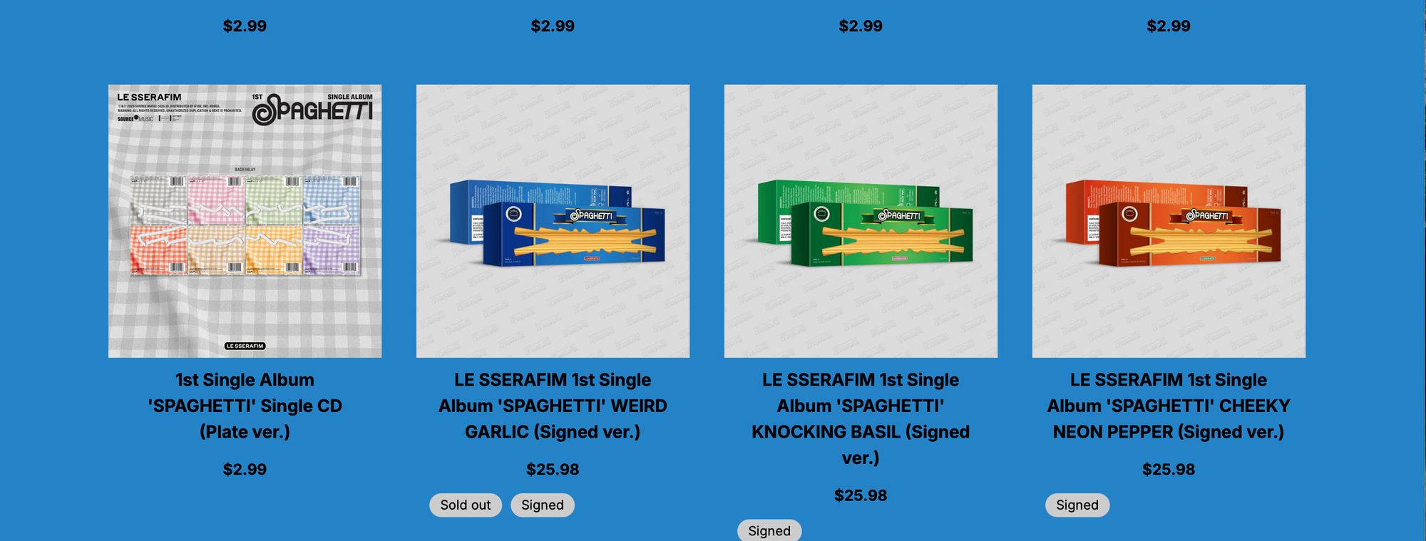 There album is called spaghetti and there packaging is really smart because its in the shape of a spaghetti box and I like how its really recognisable and stands out. The physical album comes in 20 versions: Weird Garlic, Knocking Basil, Cheeky Neon Pepper, six Compact versions (Crema Silver, Salsa Pink, Pesto Green, Alfredo Blue, Ragu Red, and Béchamel White), two Weverse Album versions (QR; A and B), Stress Ball version, and eight US-Exclusive Single version (Plate, Spaghetti, Sauce, Mushroom, Tomato, Bacon, Cheese, and Parsley).