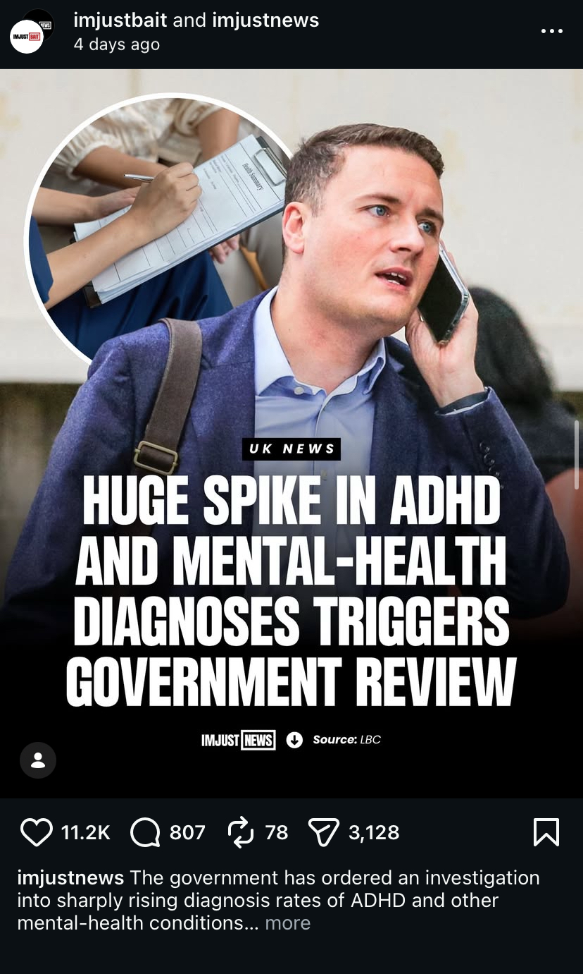 The post discusses how a spike in diagnoses for ADHD and mental health related diagnoses has triggered a government review.