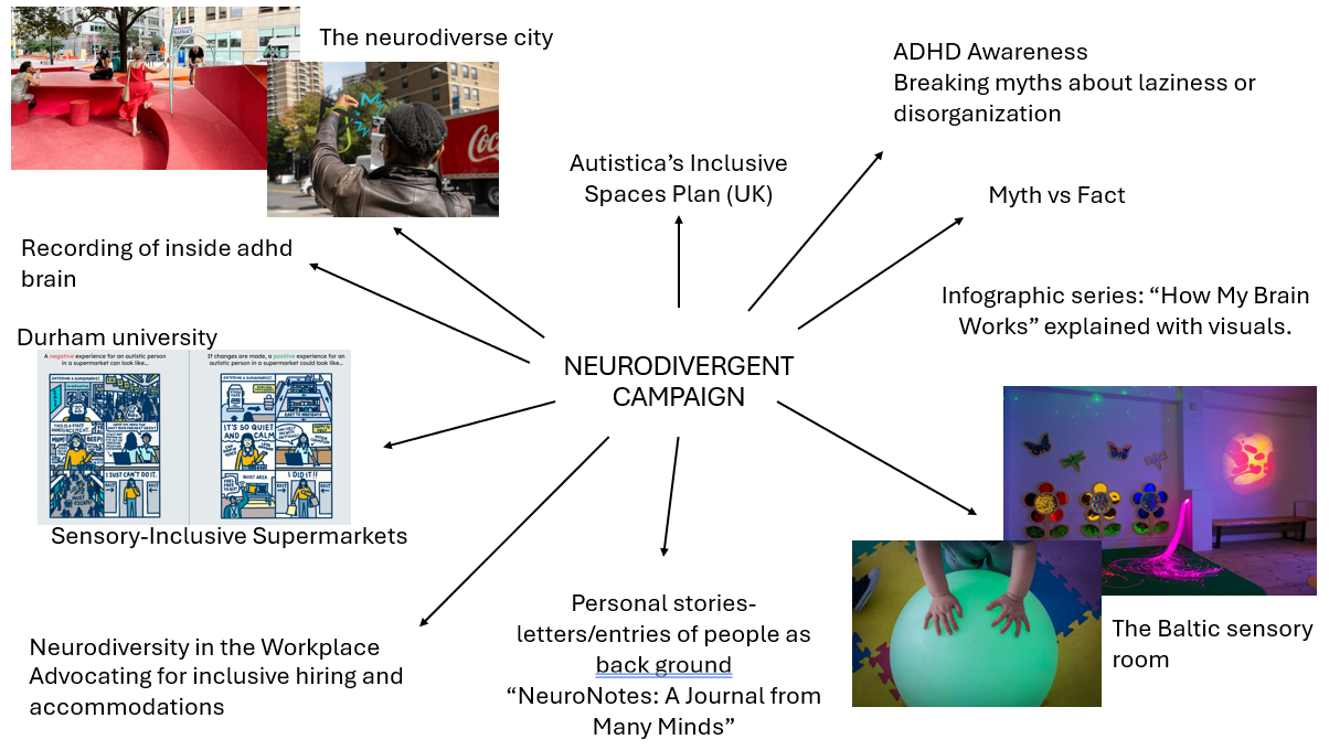 For the first week, we started off thinking about creating a campaign that raises awareness for neurodiversity in public spaces. At first, I was thinking more of how to support neurodiversity in public spaces rather than spreading awareness. When researching more into this, I had an idea to potentially use neurodivergent stories from people who are willing to share. This spreads awareness about potential struggles they face and how they have learnt to deal with this. 'NeuroNotes: A journal from Many Minds' was me just thinking about a title which would fit this campaign.