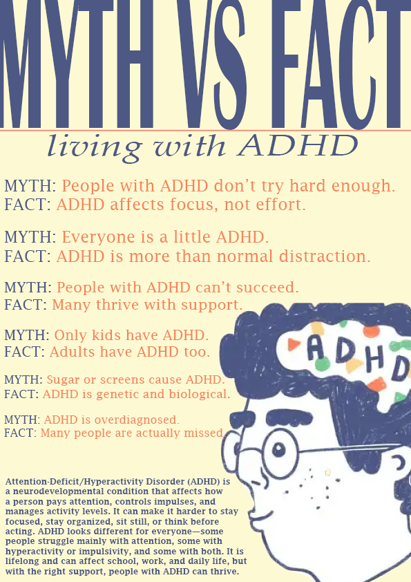 Another idea I thought of, to mainly spread awareness on ADHD was to create something which breaks the myths about the laziness and disorganisation of ADHD. Creating a myth vs fact campaign, hopefully stopping stereotypes.