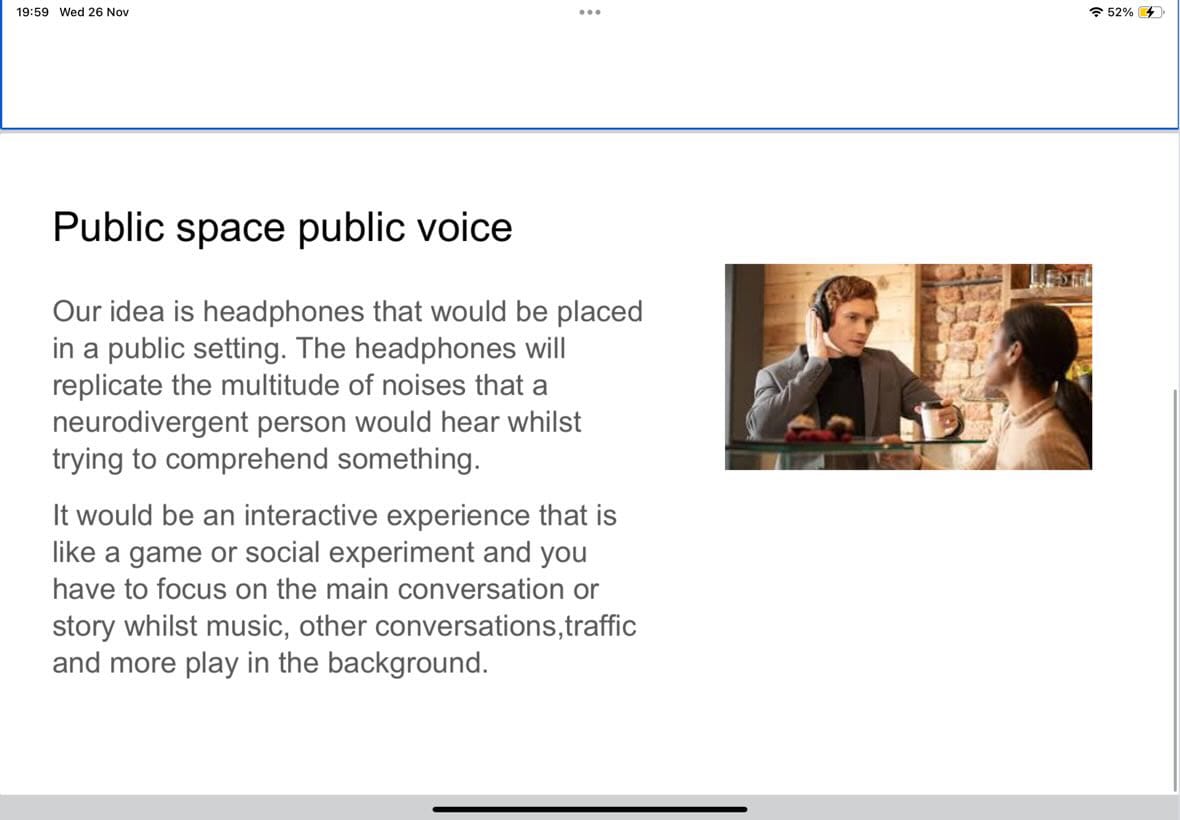 In this brief we were asked to create a hypothetical idea of raising awareness of neurodivergent awareness by creating an exhibition. We did it by talking about and using figma to create ideas. I found speaking about it freely the best way of finding solutions rather than any other method. I find it easier to communicate when I am "bouncing off" other peoples' ideas.