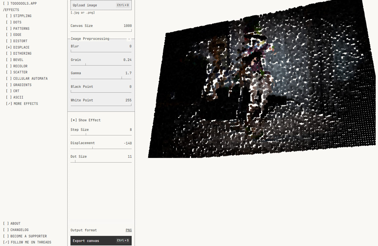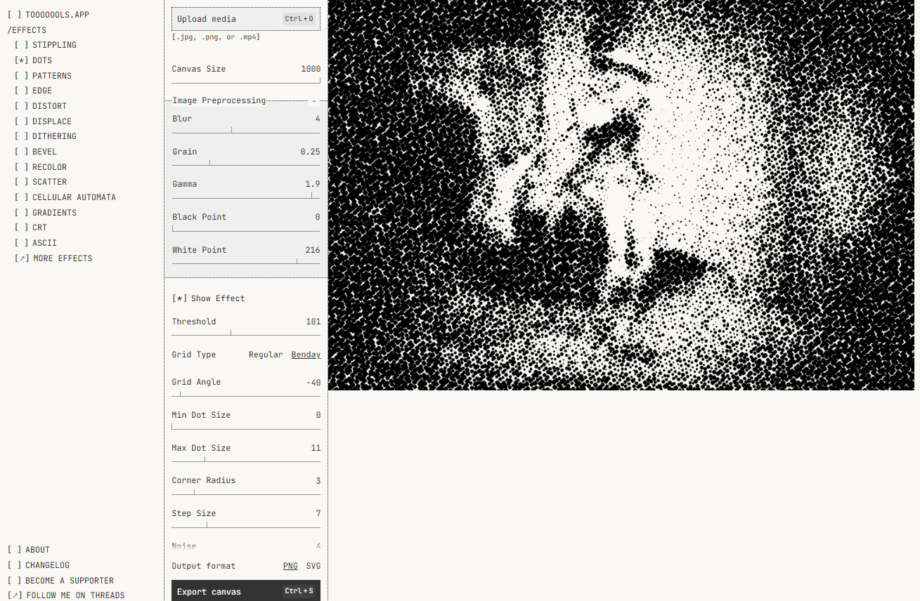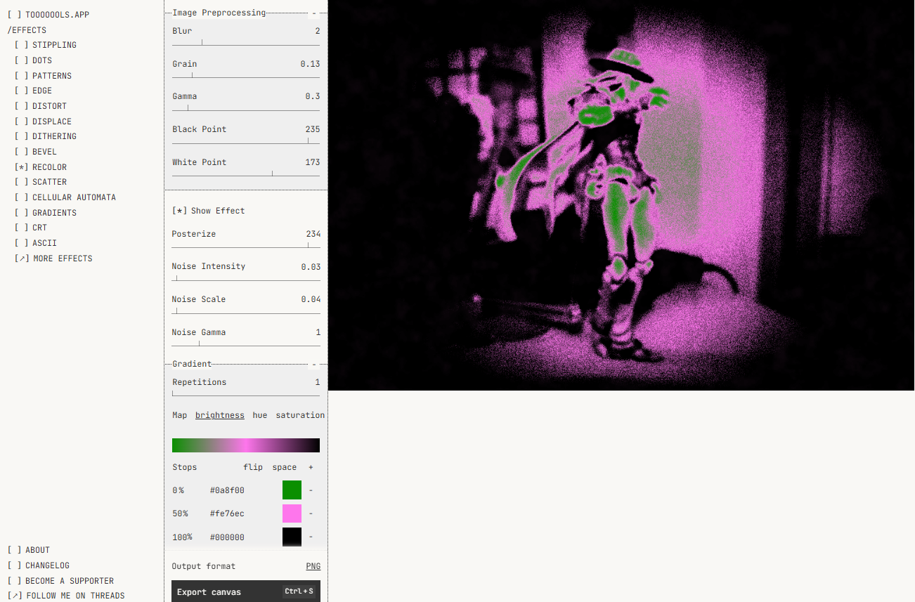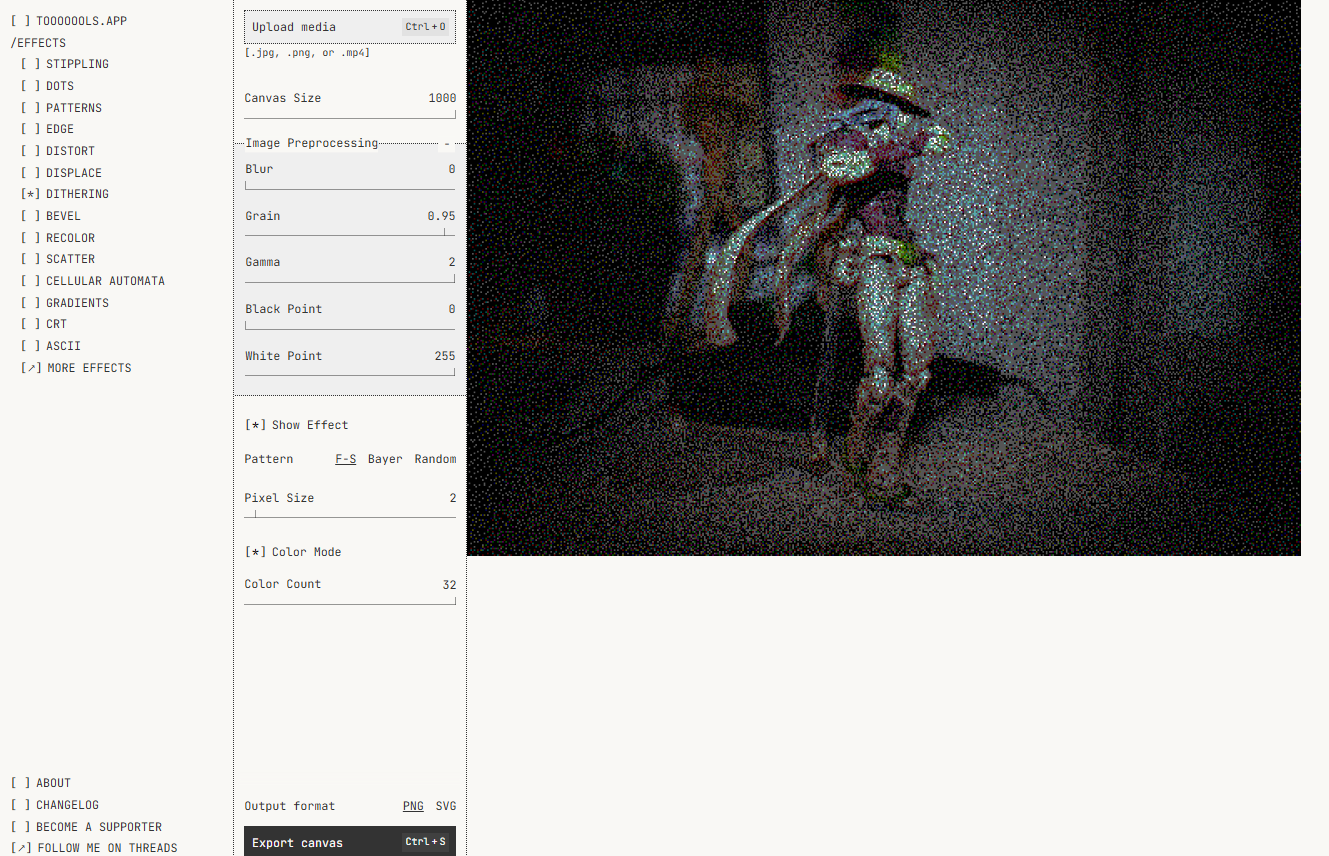 Apply lo-fi effects to your images and videos: dithering, halftone, gradients, patterns and more. Free, no sign-up required.