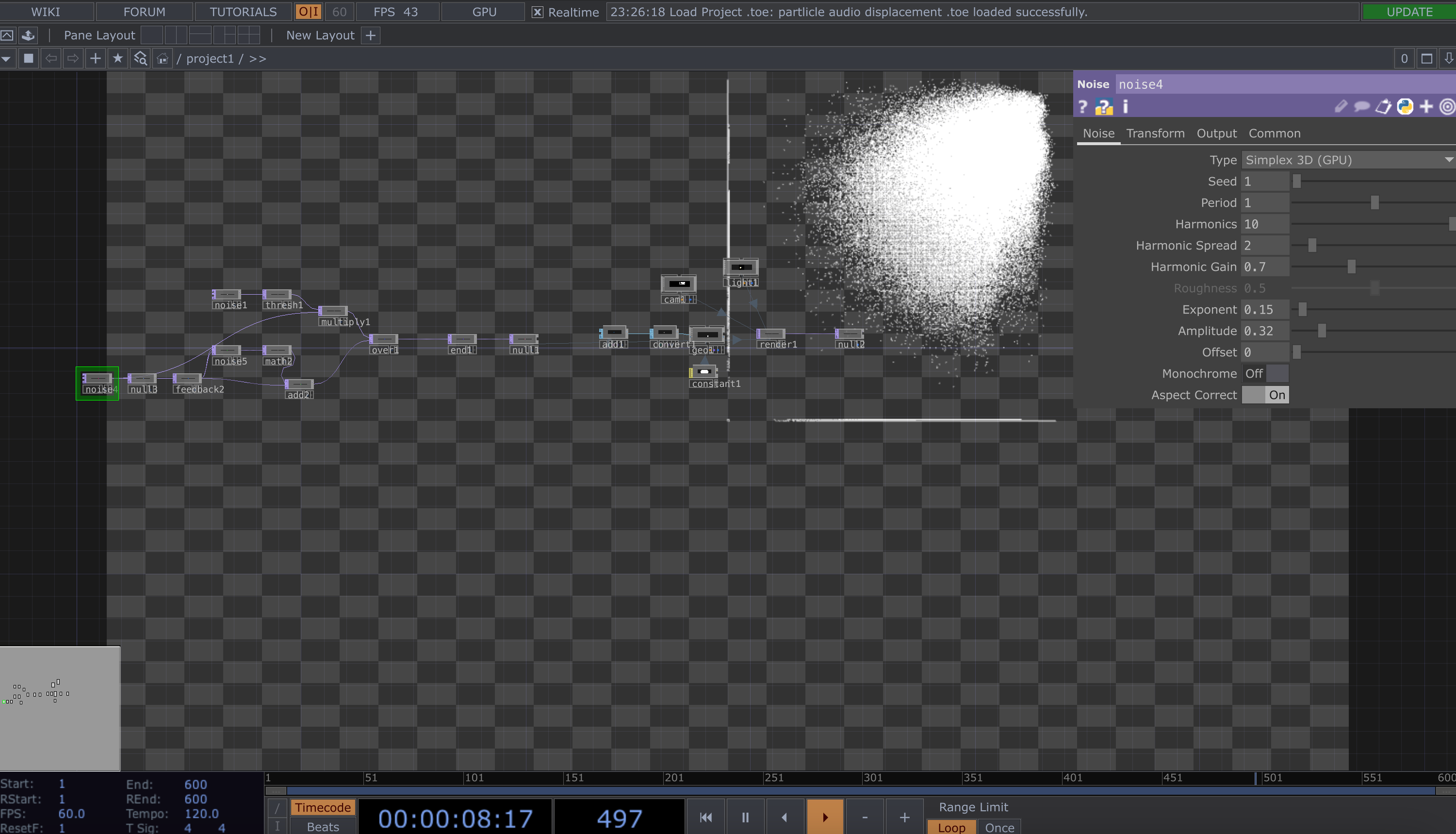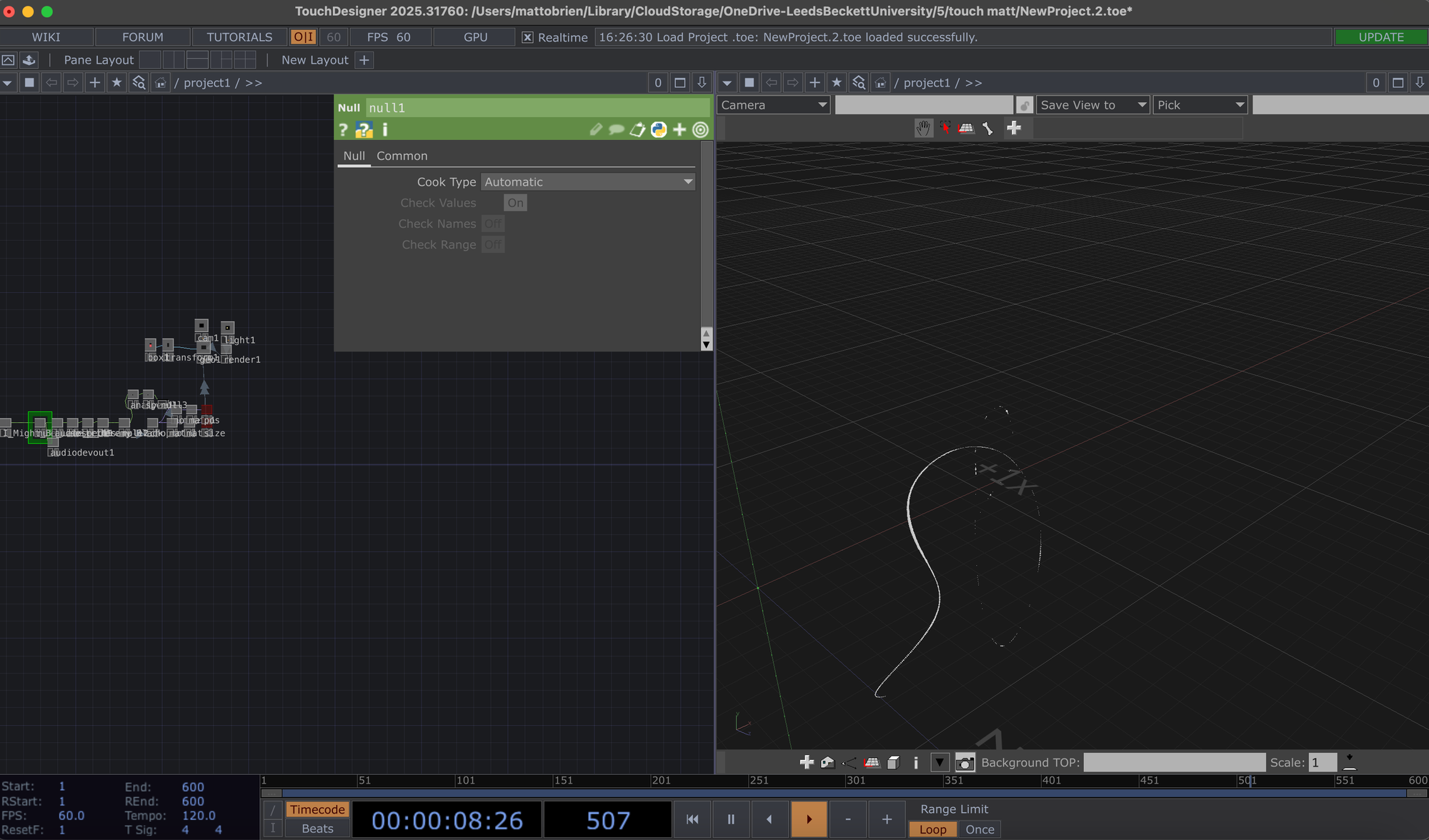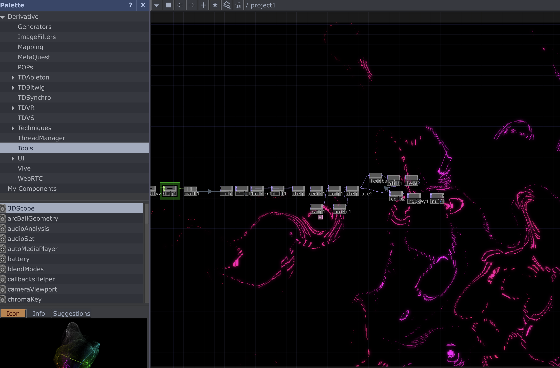 Touch Designer is a node based program allowing you to build systems which combine graphics, audio, video and user interaction, this all runs live. This allows these visuals to be altered by the environment they are which can create some interesting scenes in real time.