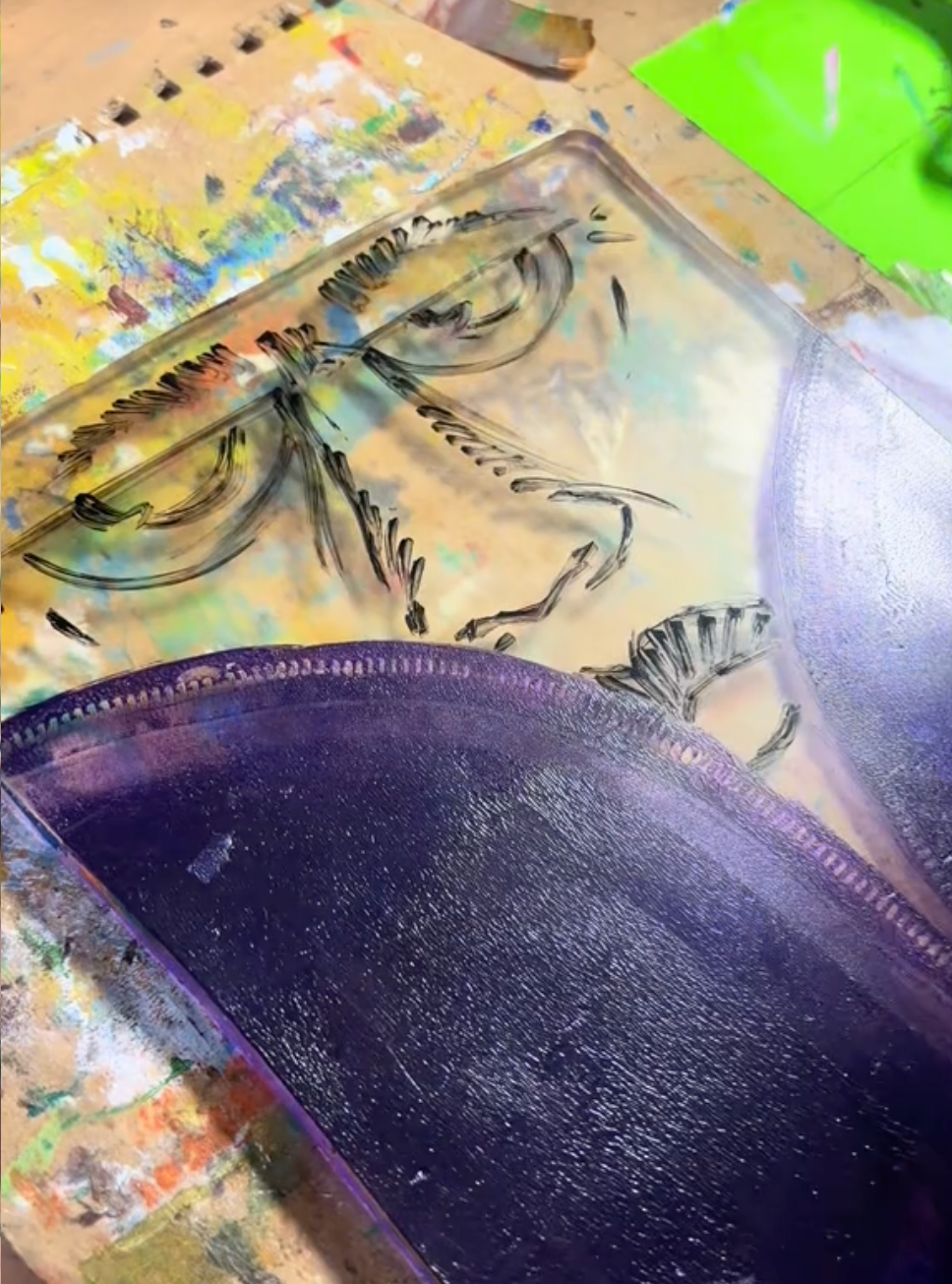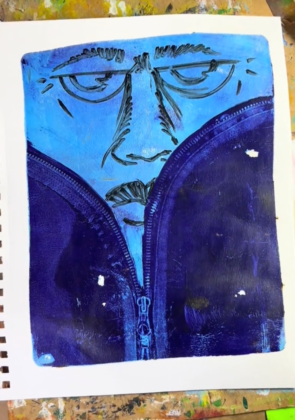 I have been into gelli printing for a while now and have messed around with it, alot inspired by this creator. This video especially to me is so interesting, they cut out a zipper from a jacket and used it to texture the jacket for the image they created and used marker to draw the face whereas most people i see gelli printing use the plate just for collaging and transferring images. https://www.tiktok.com/@d3tailed/video/7523724513477987598?is_from_webapp=1&sender_device=pc&web_id=7506907896031856150