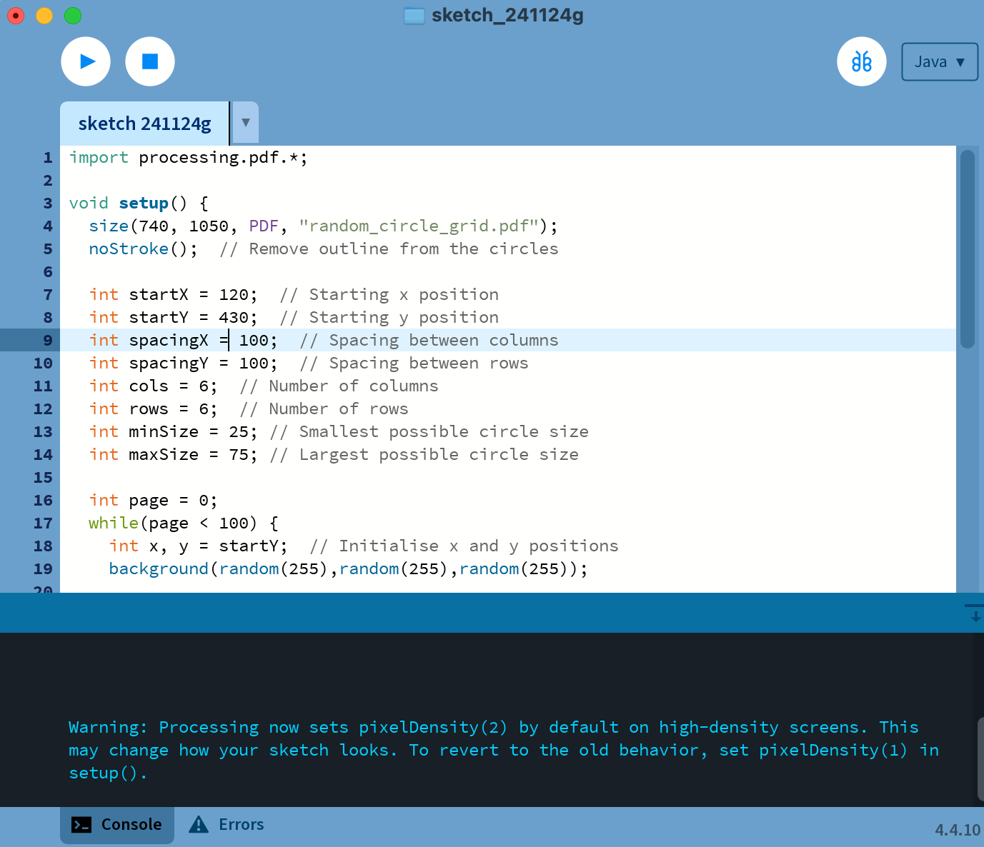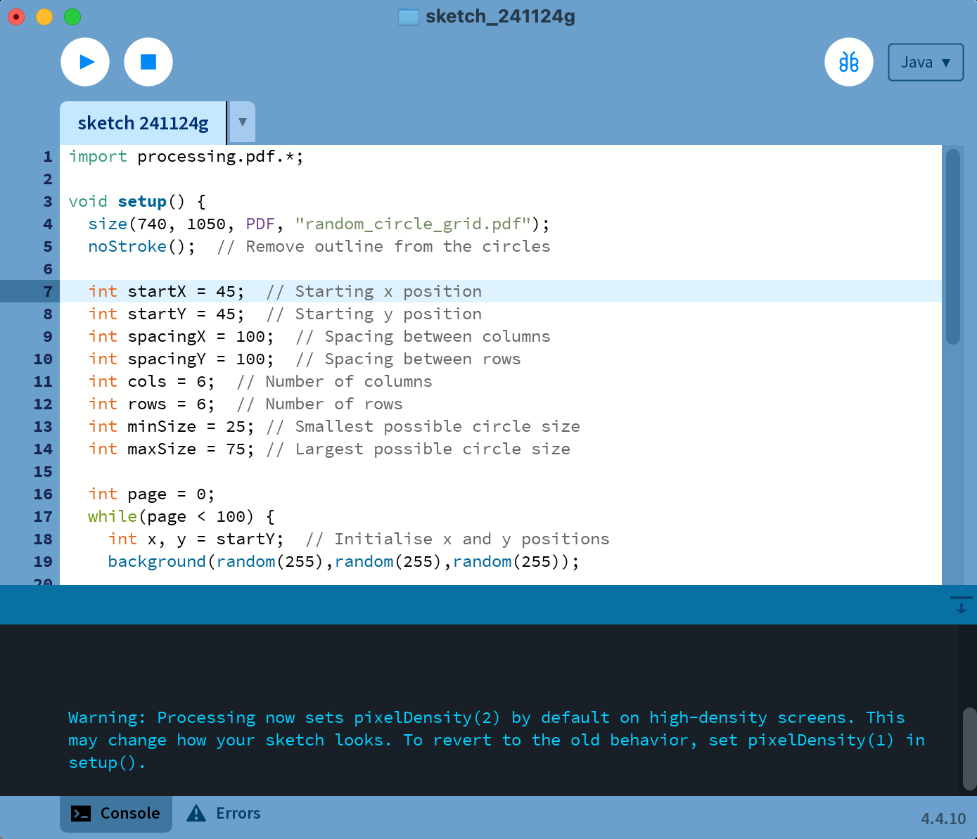 We used the application 'Processing' which is a coding language which helps with efficiency, in this case it was to create 100 different variations of the same book design. This would be useful if in a situation where you are given a client something and they ask for a variety in responses.