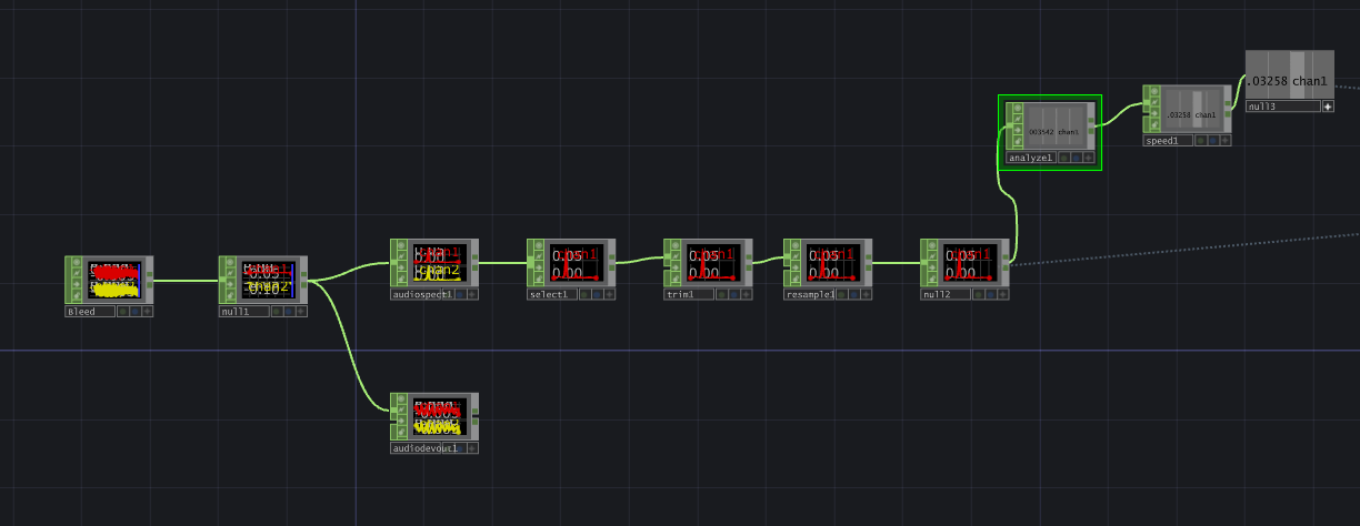 At first the sample rate was too high so I had to lower it down to a normal level which it could process the visuals at a normal level. I then added a analyse and a speed channel. This detected the speed of the song and when the songs volume went down the speed decreased.