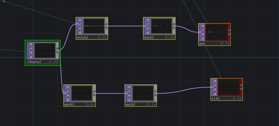 The next part were my TOPS (Texture Operator). These nodes allow noise and other textures to be applied to the 3d elements to your project. These changed the position of the boxes and size when reacting to the audio. This added movement to the project.