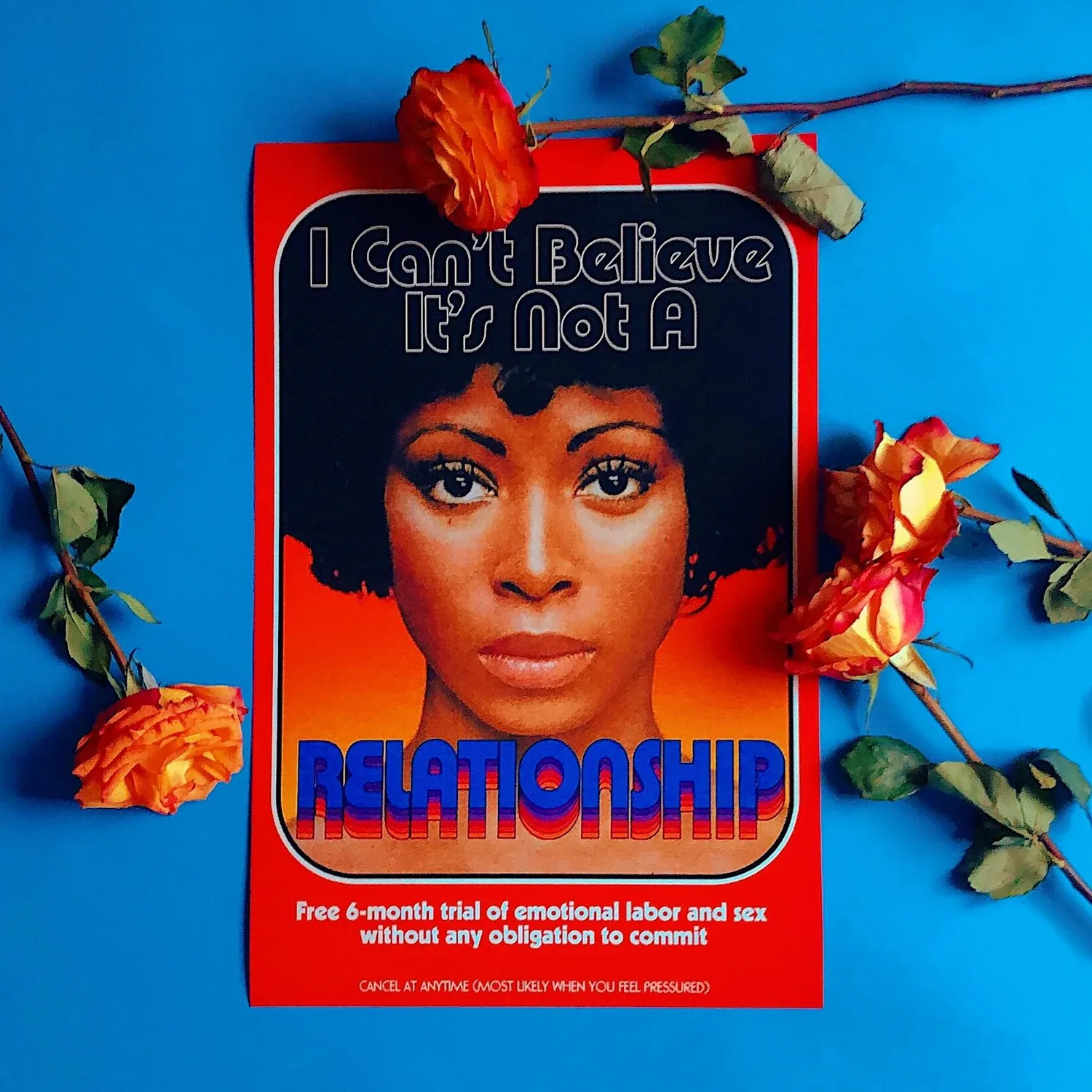 Her design work is defined by her use of retro 70’s aesthetics – bright colour pallets, archived imagery and strong typography – that reflect her cultural influence. She uses era specific photographs of black women at the forefront of her work overlaying them with humorous modern messages that convey her social views that raise important topics surrounding women – sexual autonomy, dating culture and mental health (Gill, 2019b).